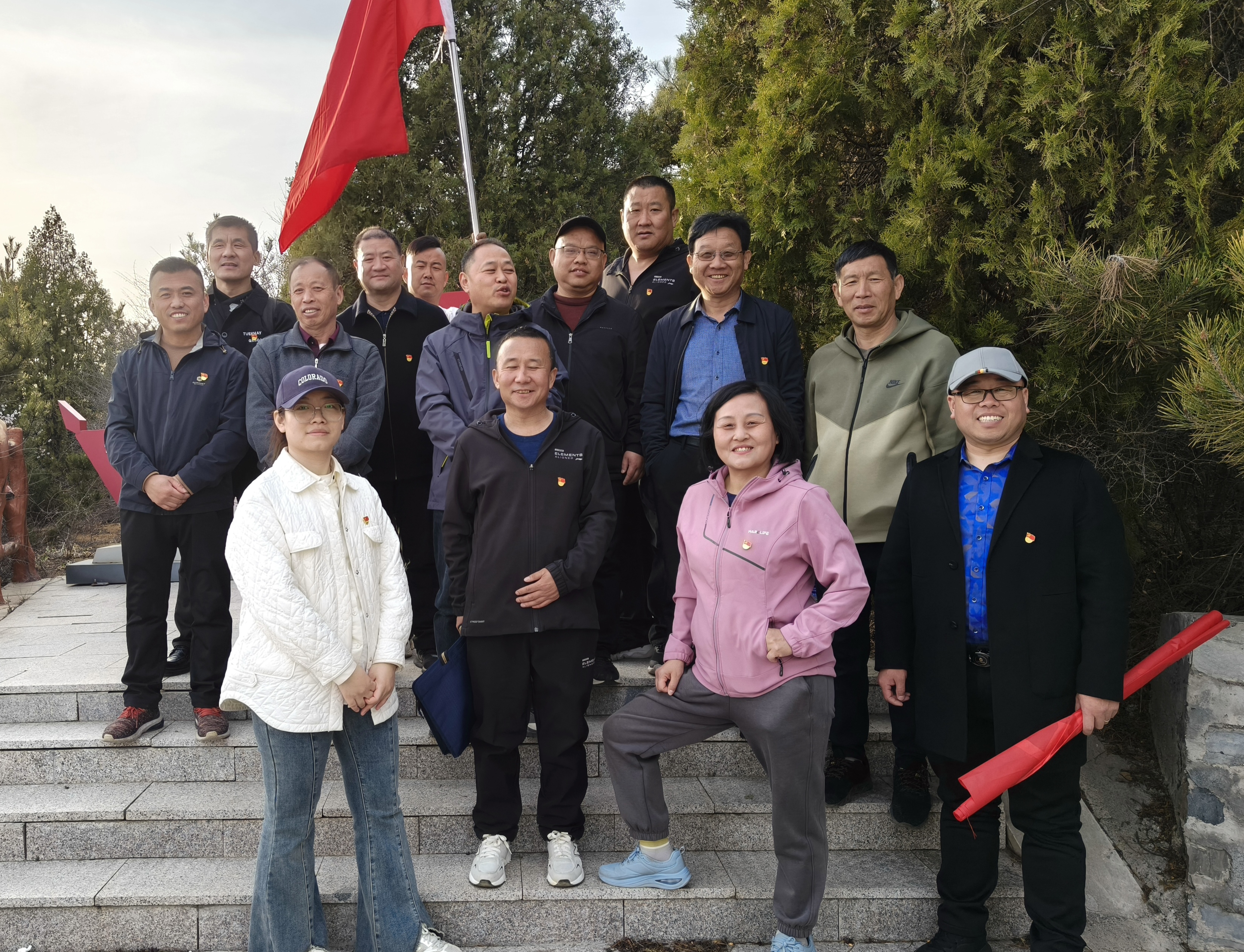 下午2:30參加支部黨員人員佩戴黨徽,著裝整潔,在活動集合點白馬寺前廣場按時集合后,隨后排著整齊的隊列,健步向活動點白馬寺后山長江支隊紀念林出發(fā)。